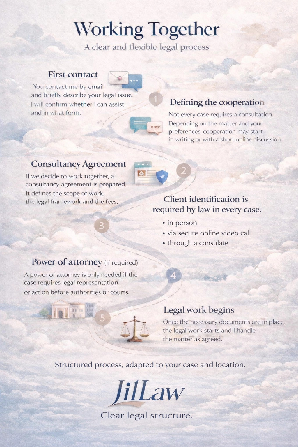 This visual overview shows how legal cooperation typically works from first contact to active legal representation.