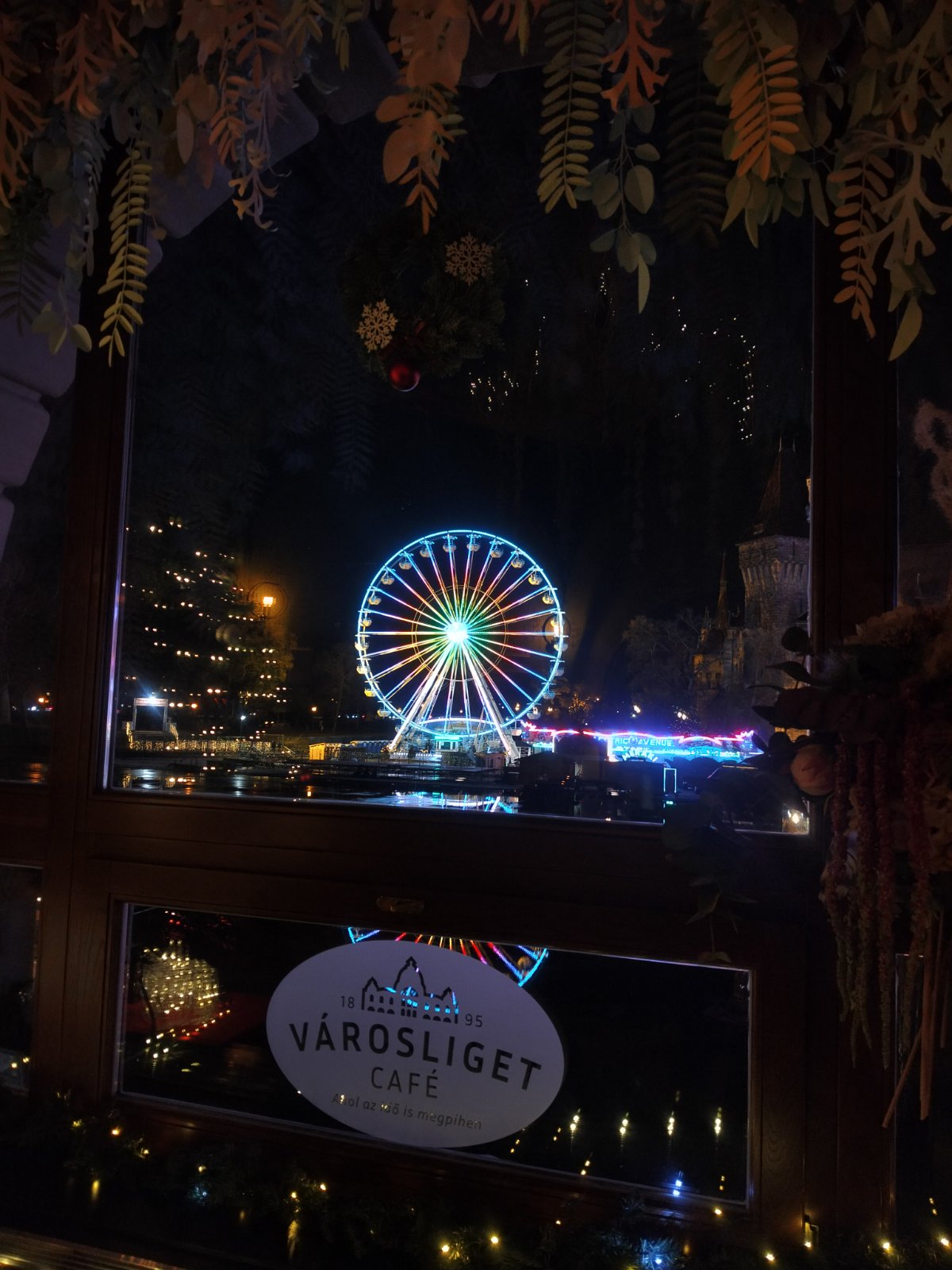 A Városliget Café ablakán túl a Happy Wonderland ünnepi fényei adtak különleges hátteret az estének. A jégpálya ugyan még nem nyitott ki (nagyon, de nagyon sajnáltam), de az óriáskerék és a karácsonyi fényjáték így is olyan látványt adott, amelyhez nehéz lenne hasonlót találni Budapest más pontján november végén.